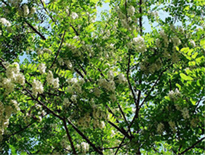 刺槐,又名洋槐。拉丁文名:Robinia pseudoacacia L.豆科、刺槐属落叶乔木,树皮灰褐色至黑褐色,浅裂至深纵裂,稀光滑。 原生于北美洲,现被广泛引种到亚洲、欧洲等地。刺槐树皮厚,暗色,纹裂多;树叶根部有一对1~2mm长的刺;花为白色,有香味,穗 状花序;果实为荚果,每个果荚中有4~10粒种子。刺槐木材坚硬,耐腐蚀,燃烧缓慢,热值高。刺槐花可食用。刺槐花产的蜂蜜很甜 ,蜂蜜产量也高。栽培变种有泓森槐、红花刺槐、金叶刺槐等。在所有刺槐树当中泓森槐生长最快,被称为刺槐树之王。