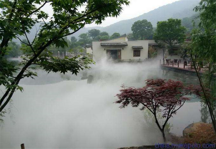 人造雾设备系统是取用被净化处理过后的自来水,进入人造雾主机,由主机加压至5-7MPa,经高压管道道输送至喷雾场所,最后由结构精密的雾化喷头高速喷出,形成雾化颗粒仅为5-10微米的雾团,瞬间产生的大量细微水雾粒子在短时间内迅速达到浓浓的飘渺白雾效果,如同山中自然云雾,景观效果极其引人入胜,同时更兼具除尘降尘、净化加湿空气的功能;水雾中含有大量负离子,置身其中有益身心健康。