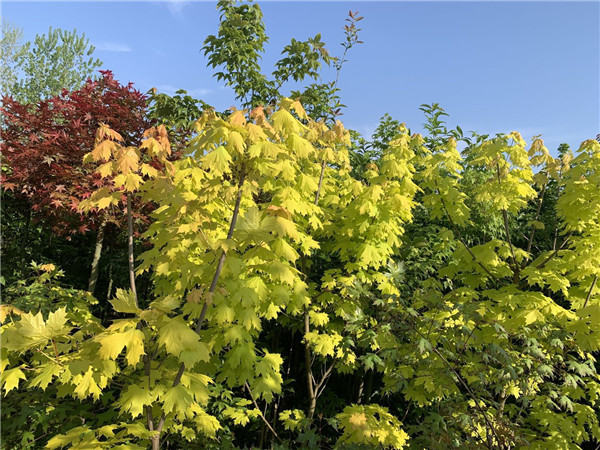 黄金枫大树夏天变淡绿色,春秋变金黄带彩红色,无比美丽。
