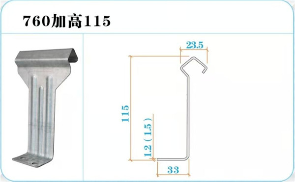 760支架用途:从名字可以看出,760支架是和角驰760型彩钢板的规格型号来搭配使用的,多用于大跨度的钢结构厂房,支架固定在檩条上,起到固定支撑760屋面彩钢板的作用,相对于自攻钉,具有可隐藏性,所以我也叫760暗扣支架,因为不穿透彩钢瓦,所以防水效果极好。