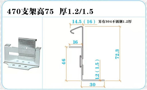 470支架开口:大开口:16mm; 小开口:14.5mm。470支架是一种热镀锌材料通过工艺生产出来的一种直立锁边彩钢瓦专用的滑动暗扣支架, 470屋面角驰支架为360度直立锁边滑动暗扣式支架