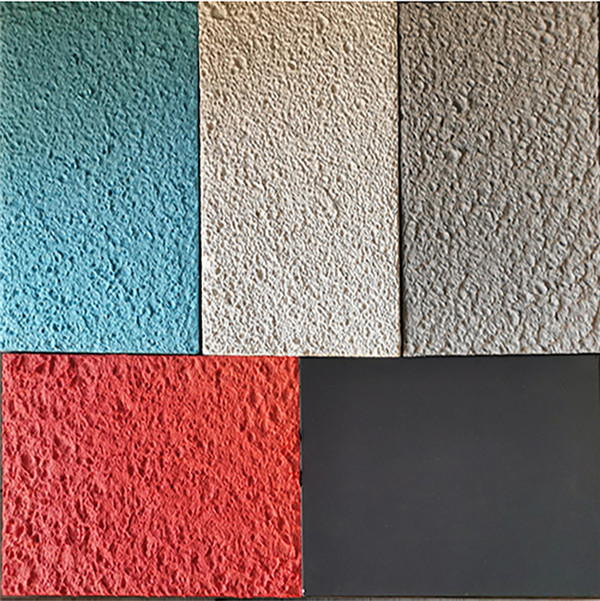 颜色:色泽丰富,请阅读色卡。由于防火乳液和吸音纤维特有的性能,调颜色方面只能5到6成接近色卡,无法像普通涂料乳胶漆调色那么标准。如果某些工程对颜色要求一致性非常严格,先喷吸音涂料,24小时后,在表面再喷涂二层同颜色的吸音乳胶漆,这样一般都可以达到颜色一致要求,但是会少量影响吸音效果,所以一般建议不要再喷面漆罩色;(提示:由于表面凹凸不平,不同角度,不同光线看,颜色会略有差别);如果需要接近相对平面效果,请用平嘴枪嘴,直着喷,不要倾斜,喷涂之后,根据需求,可以用刮涂工具,刮平一下,需要技巧。如果需要凹凸感比较强,一般倾斜45度角来喷涂,调整风力,灵活掌握,根据现场情况。