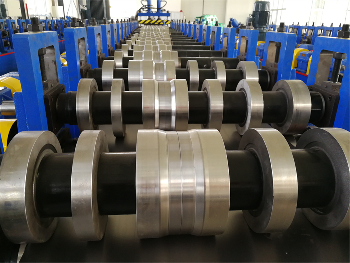 该机组设备占地约100平方米,设备组成主要包括:放料装置、校平装置、自动送料装置、冲孔装置、高精度冷弯成型主机、自动焊接、定尺切断装置、收料装置、电气控制系统等部件组成;